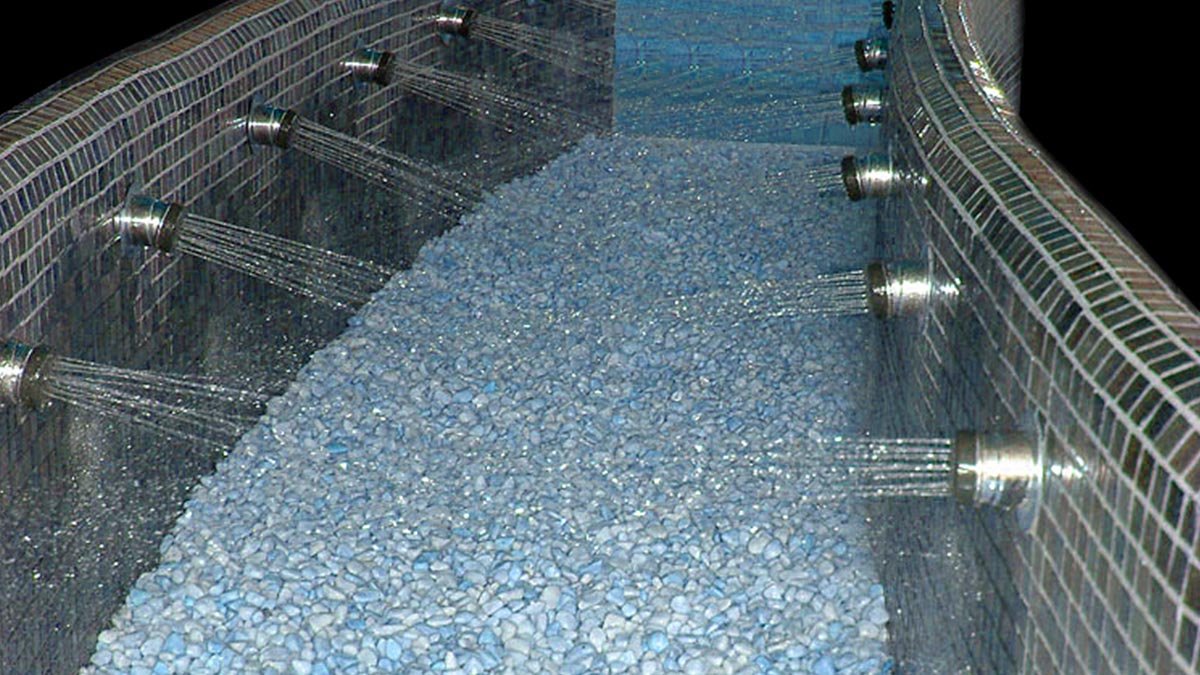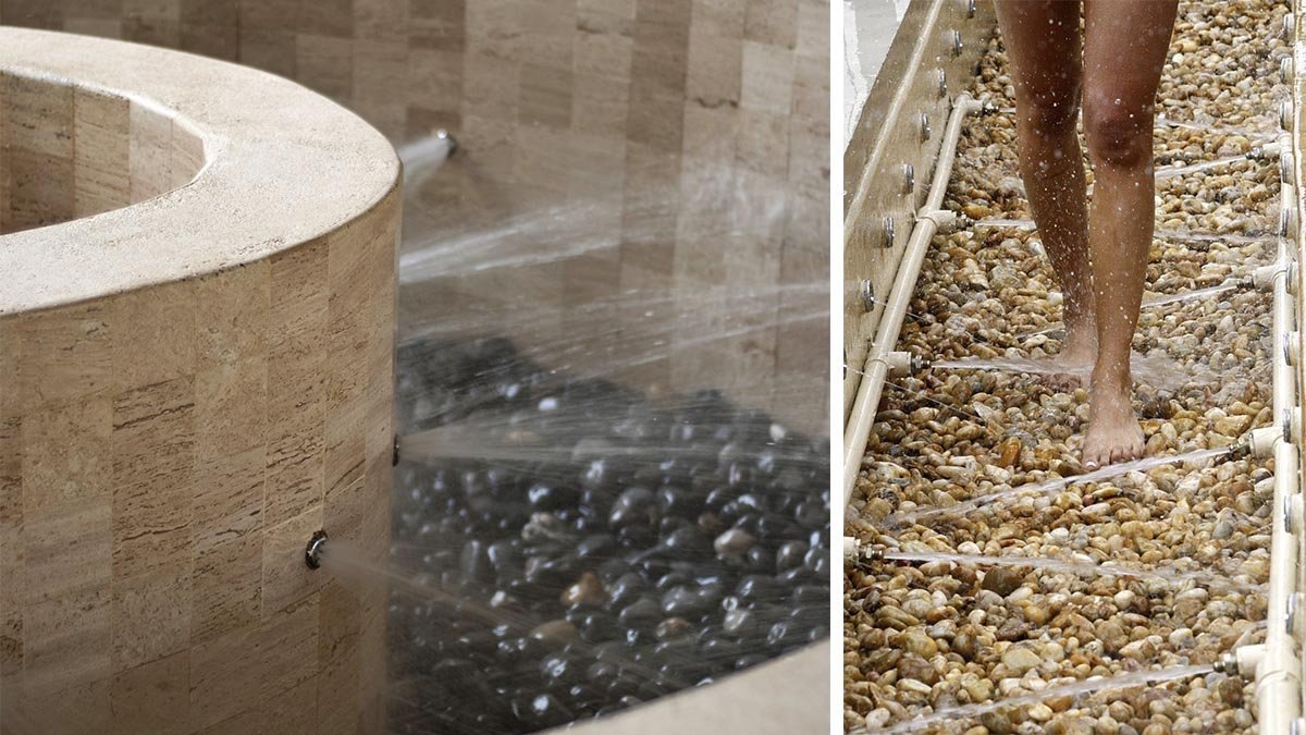 Un recorrido sensorial que combina los beneficios del agua fría y caliente al caminar descalzo sobre una base de cantos rodados.